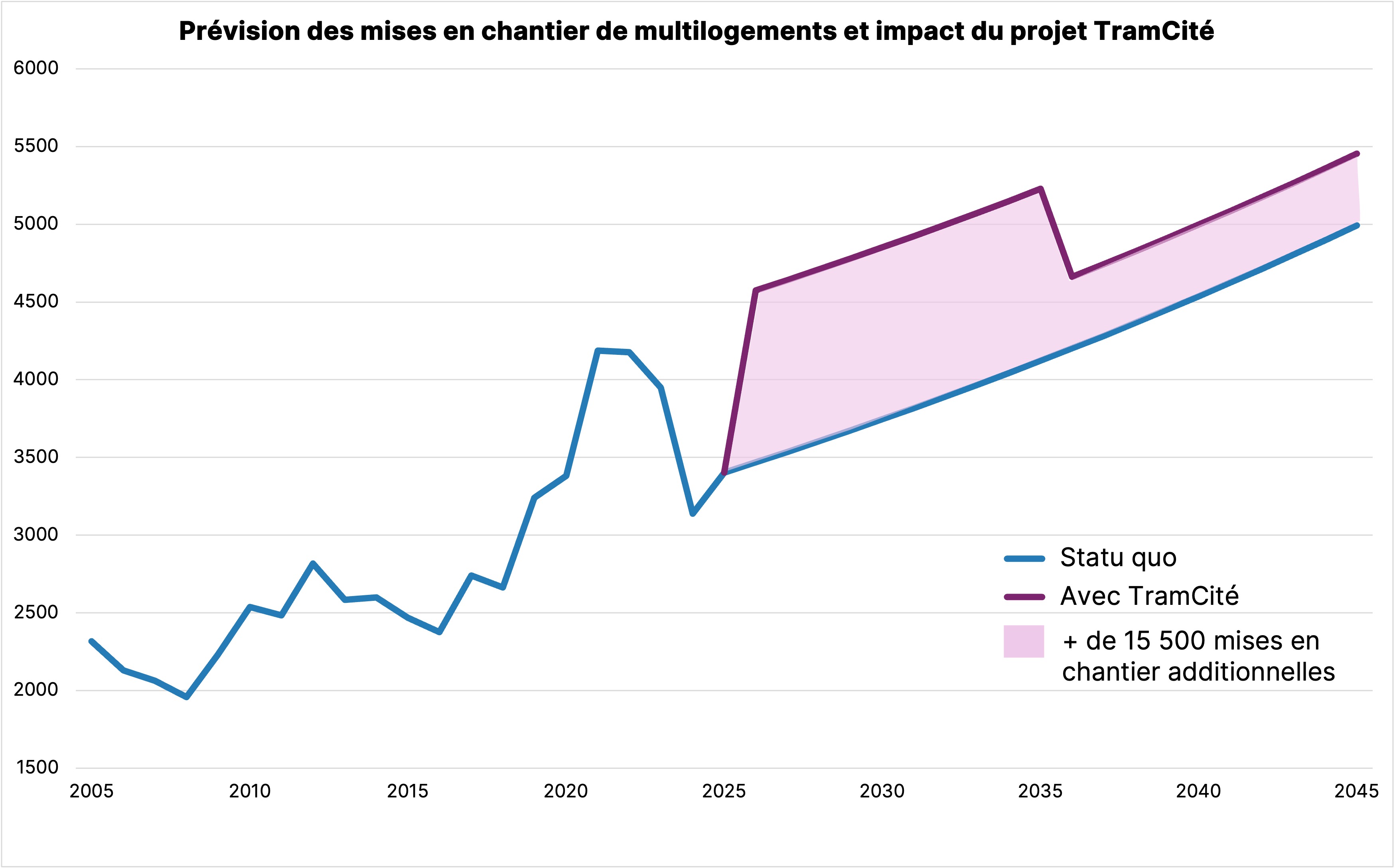 Grâce à l’arrivée de TramCité, plus de 15 500 logements supplémentaires seront construits autour du tracé. De ce nombre, 11 000 seront mis en chantier d’ici 2035. Il s’agit d’une hausse de près de 20 % des mises en chantier par rapport à un scénario sans tramway.